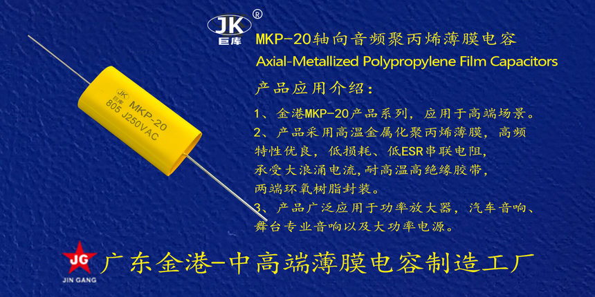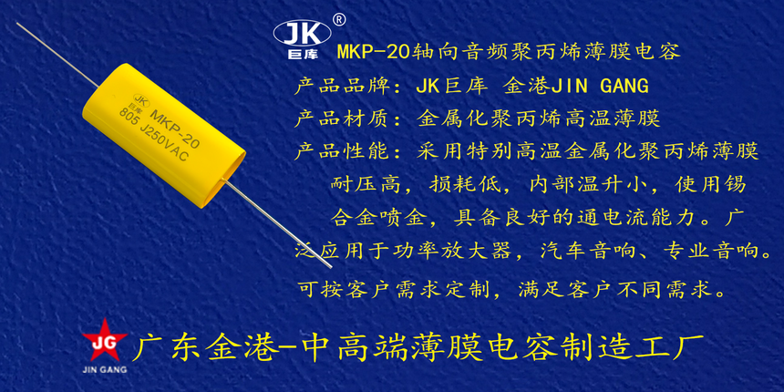 産品(pin)品牌 :JK巨(ju)庫金港(gang)JINGANG 産品材(cái)質: 金屬(shu)化聚丙(bing)烯高溫(wen)薄膜 産(chan)品性能(neng): 采用高(gao)溫金屬(shu)化聚丙(bǐng)烯薄膜(mó) 耐壓高(gāo),損耗低(di),内部溫(wen)升小,使(shi)用錫合(hé)金噴金(jin), 具備良(liáng)好的通(tōng)電流能(néng)力。 産品(pǐn)作用: 廣(guang)泛應用(yòng)于功率(lǜ)放大器(qi),汽車音(yin)響、專業(yè)音響。 定(dìng)制加工(gong) :可按客(ke)戶需求(qiú)定制,滿(mǎn)足客戶(hu)不同需(xu)求。