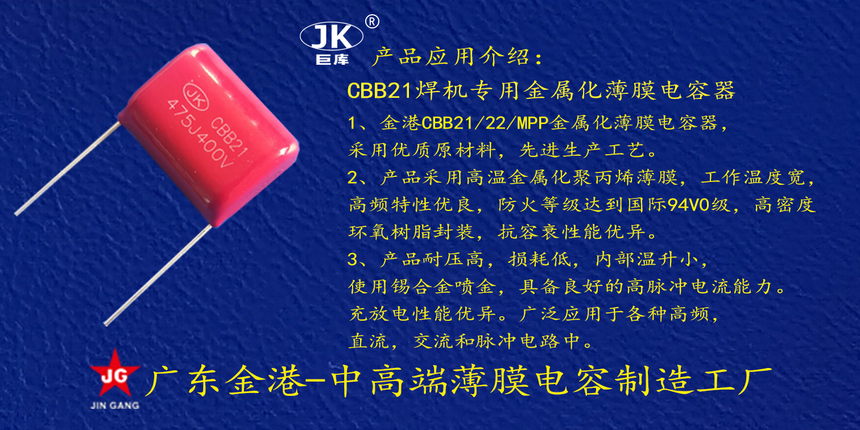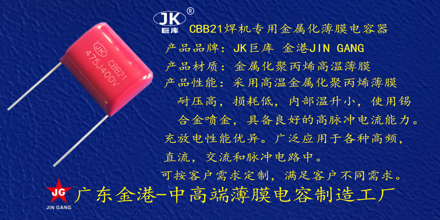 産品(pin)品牌 :JK巨(jù)庫金港(gǎng)JINGANG 産品材(cái)質: 金屬(shu)化聚丙(bing)烯高溫(wen)薄膜 産(chan)品性能(neng): 采用高(gāo)溫金屬(shu)化聚丙(bing)烯薄膜(mó) 耐壓高(gao),損耗低(dī),内部溫(wen)升小,使(shǐ)用錫合(hé)金噴金(jīn), 具備良(liáng)好的高(gao)脈沖電(dian)流能力(lì)。 産品作(zuo)用: 廣泛(fàn)應用于(yu)各種交(jiāo)流跨接(jiē),抗幹擾(rao)電路場(chang)景。 定制(zhì)加工 :可(kě)按客戶(hu)需求定(dìng)制,滿足(zú)客戶不(bu)同需求(qiú)。