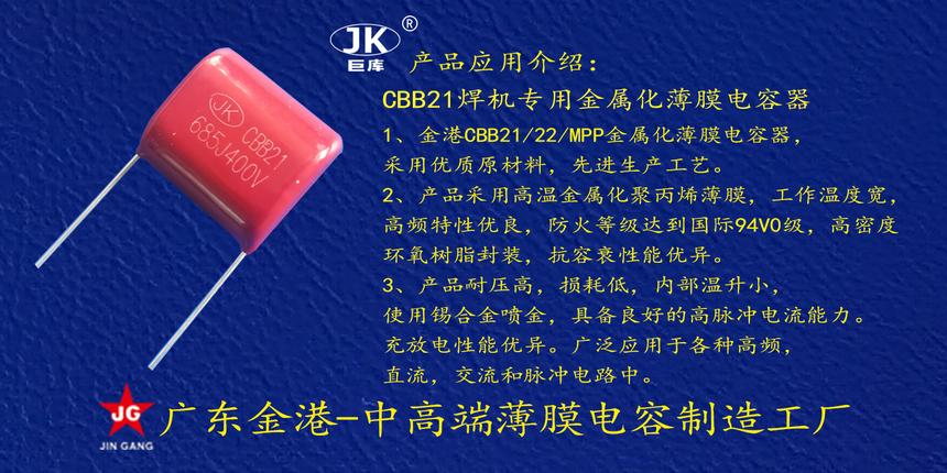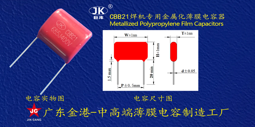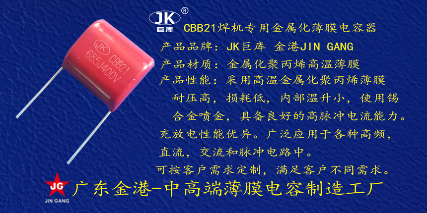 産品品牌(pái) :JK巨庫金港JINGANG 産品材(cai)質: 金屬化聚丙烯(xī)高溫薄膜 産品性(xìng)能: 采用高溫金屬(shu)化聚丙烯薄膜 耐(nai)壓高,損耗低,内部(bù)溫升小,使用錫合(he)金噴金, 具備良好(hǎo)的高脈沖電流能(neng)力。 産品作用: 廣泛(fan)應用于各種交流(liú)跨接,抗幹擾電路(lù)場景。 定制加工 :可(ke)按客戶需求定制(zhi),滿足客戶不同需(xū)求。