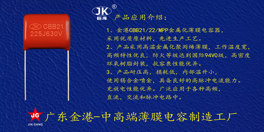 産品品(pin)牌 :JK巨庫金港JINGANG 産品(pin)材質: 金屬化聚丙(bǐng)烯高溫薄膜 産品(pin)性能: 采用高溫金(jin)屬化聚丙烯薄膜(mo) 耐壓高,損耗低,内(nei)部溫升小,使用錫(xī)合金噴金, 具備良(liang)好的高脈沖電流(liú)能力充放電性能(neng)優異。 産品作用: 廣(guang)泛應用于各種高(gāo)頻,直流,交流和脈(mò)沖電路中。 定制加(jia)工 :可按客戶需求(qiú)定制,滿足客戶不(bu)同需求。