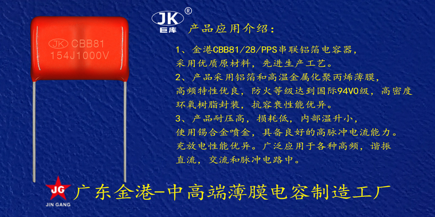 産品品牌(pai) :JK巨庫金港(gǎng)JINGANG 産品材質(zhi): 金屬化聚(jù)丙烯高溫(wēn)薄膜 産品(pin)性能: 采用(yòng)高溫金屬(shu)化聚丙烯(xi)薄膜 耐壓(ya)高,損耗低(dī),内部溫升(shēng)小,使用錫(xī)合金噴金(jin), 具備良好(hǎo)的高脈沖(chong)電流能力(li),充放電性(xìng)能優異。 産(chǎn)品作用: 廣(guang)泛應用于(yú)各種高頻(pín)諧振,直流(liú),交流和脈(mò)沖電路🆚中(zhōng)。 定制加工(gōng) :可按客戶(hu)需求定制(zhi),滿足客戶(hu)不同需求(qiú)。