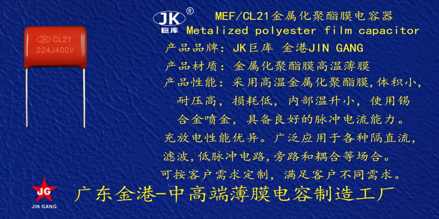 産品品牌 :JK巨(jù)庫金港JINGANG 産品材(cái)質: 金屬化聚丙(bǐng)烯高溫薄膜 産(chǎn)品性能: 采用高(gāo)溫金屬化聚丙(bǐng)烯薄膜 耐壓高(gāo),損耗低,内部溫(wēn)升小,使用錫合(hé)金噴金, 具備良(liang)好的高脈沖電(diàn)流能力,充放電(dian)性能優異。 産品(pǐn)作用: 廣泛應用(yòng)于各種隔直流(liú)濾波,低脈沖電(dian)路,旁路和耦合(he)❄️等場合。 定制加(jia)工 :可按客戶需(xu)求定制,滿足客(kè)戶不同需求。