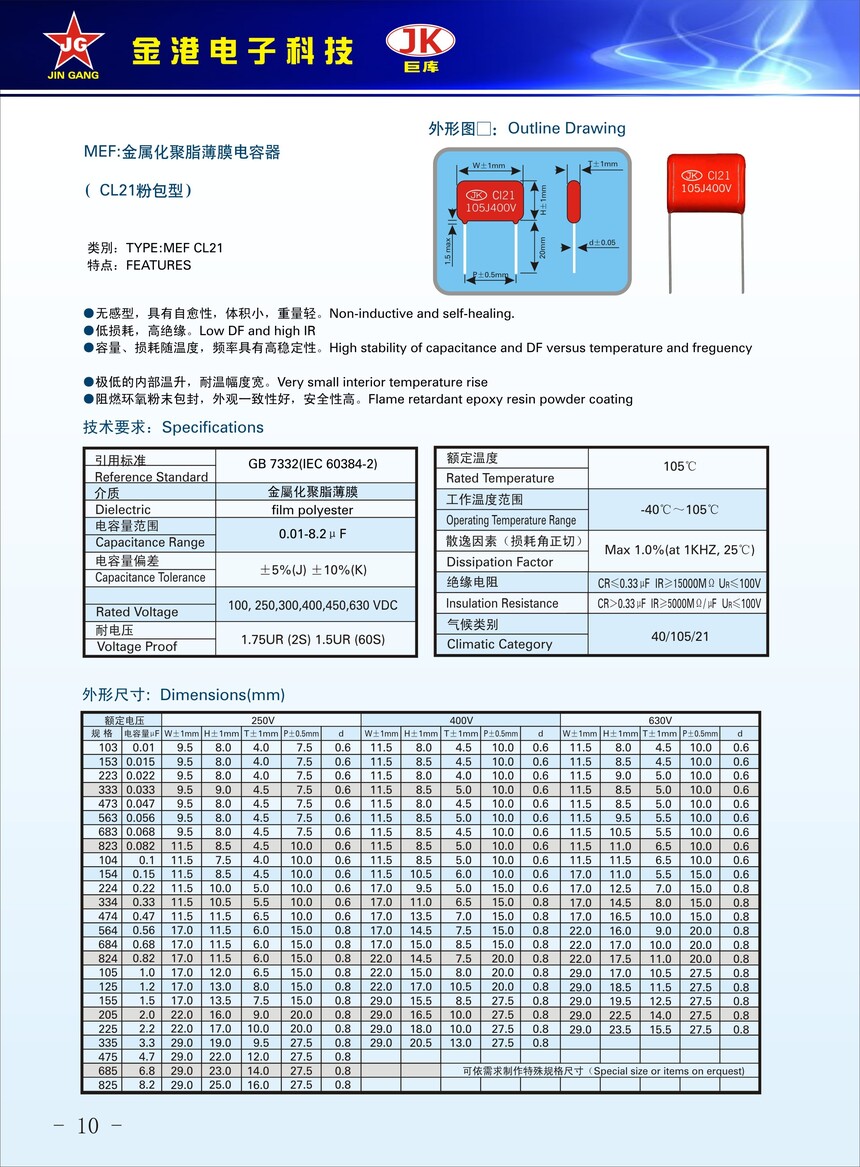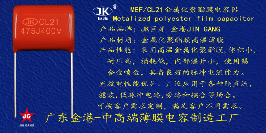 産品品牌 :JK巨(jù)庫金港JINGANG 産品材(cai)質: 金屬化聚丙(bing)烯高溫薄膜 産(chan)品性能: 采用高(gāo)溫金屬化聚丙(bing)烯薄膜 耐壓高(gāo),損耗低,内部溫(wēn)升小,使用錫合(he)金噴金, 具備良(liang)好的高脈沖電(dian)流能力,充放電(diàn)性能優異。 産品(pǐn)作用: 廣泛應用(yòng)于各種隔直流(liú)濾波,低脈沖電(diàn)路,旁路和🔅耦合(he)🛀🏻等場合。 定制加(jia)工 :可按客戶需(xu)求定制,滿足客(ke)戶不同需求。