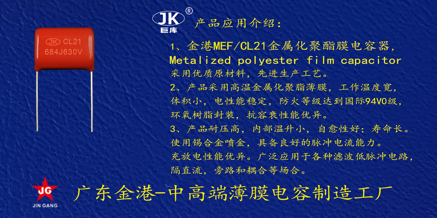 産品品(pin)牌 :JK巨庫金(jin)港JINGANG 産品材(cai)質: 金屬化(huà)聚丙烯高(gāo)溫薄膜 産(chǎn)品性能: 采(cai)用高溫金(jin)屬化聚丙(bing)烯薄膜 耐(nai)壓高,損耗(hao)低,内部溫(wēn)升小,使用(yòng)錫合金噴(pen)金, 具備良(liáng)好的高脈(mo)沖電流能(neng)力,充放電(dian)性能優異(yi)。 産品作用(yong): 廣泛應用(yong)于各種隔(ge)直流濾波(bō),低脈沖電(diàn)路,旁路和(he)📧耦合等📐場(chǎng)🚶♀️合。 定制加(jia)工 :可按客(kè)戶需求定(dìng)制,滿足客(ke)戶不同需(xu)求。