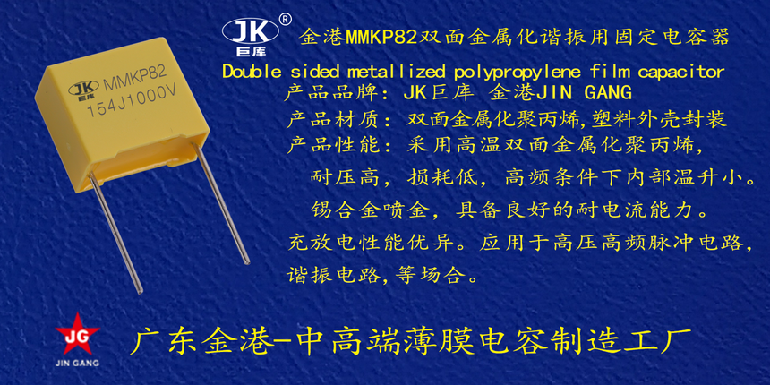 産(chan)品品牌 :JK巨庫金(jīn)港JINGANG 産品材質: 雙(shuang)面金屬化聚丙(bing)烯,塑料外殼封(feng)裝 産品性能: 采(cǎi)用高溫雙面化(huà)聚丙烯,耐壓高(gāo), 損耗低,高頻條(tiao)件下内部溫升(shēng)小。錫合金噴金(jin), 具備良好的耐(nài)電流能力。充放(fang)電性能優異。 産(chǎn)品作用: 應用于(yu)高壓高頻脈沖(chòng)電路,諧振電路(lu),等場合。