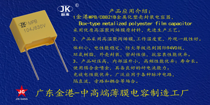 産品品(pin)牌 :JK巨庫金港(gang)JINGANG 産品材質: 高(gāo)溫金屬化聚(ju)丙烯,塑料外(wài)殼封裝 産品(pin)性能: 采用高(gao)溫金屬化聚(ju)丙烯,耐壓高(gao)産品一緻性(xìng)好, 損耗低,内(nei)部溫升小。錫(xi)合金噴金, 具(ju)備良好的耐(nai)電流能力。充(chōng)放電性能優(yōu)異。 産品作用(yong): 應用于高壓(ya)高頻脈沖電(diàn)路,諧振電路(lu),等場合。