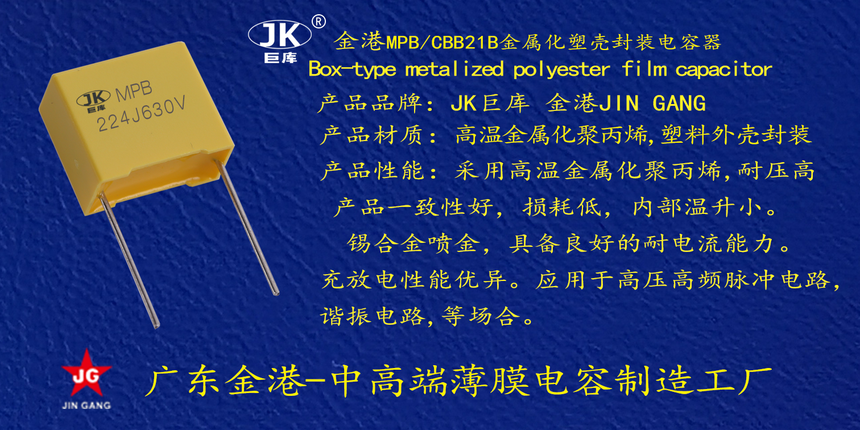 産品品(pin)牌 :JK巨庫金港(gang)JINGANG 産品材質: 高(gāo)溫金屬化聚(ju)丙烯,塑料外(wài)殼封裝 産品(pin)性能: 采用高(gao)溫金屬化聚(ju)丙烯,耐壓高(gao)産品一緻性(xìng)好, 損耗低,内(nei)部溫升小。錫(xi)合金噴金, 具(ju)備良好的耐(nai)電流能力。充(chōng)放電性能優(yōu)異。 産品作用(yong): 應用于高壓(ya)高頻脈沖電(diàn)路,諧振電路(lu),等場合。